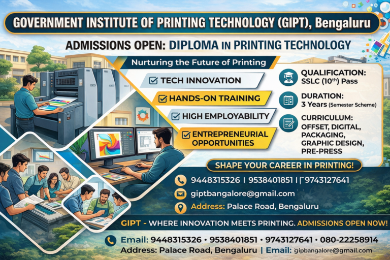 Government Institute of Printing Technology (GIPT) ಬೆಂಗಳೂರು: ಡಿಪ್ಲೊಮಾ ಇನ್ ಪ್ರಿಂಟಿಂಗ್ ಟೆಕ್ನಾಲಜಿ ಕೋರ್ಸ್ ಸಂಪೂರ್ಣ ಮಾಹಿತಿ ಇಂದಿನ ಡಿಜಿಟಲ್ ಕ್ರಾಂತಿಯ ನಡುವೆಯೂ ಮುದ್ರಣ ತಂತ್ರಜ್ಞಾನ …