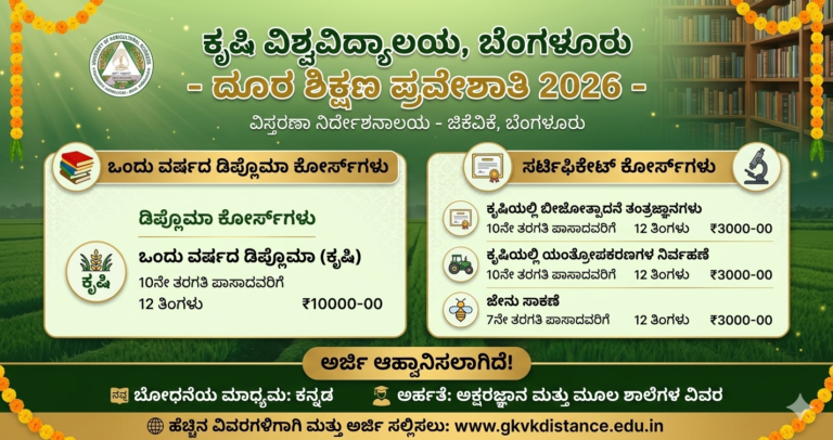 GKVK ದೂರ ಶಿಕ್ಷಣ ಪ್ರವೇಶಾತಿ 2026: ಕೃಷಿ ಕ್ಷೇತ್ರದಲ್ಲಿ ಸ್ವಯಂ ಉದ್ಯೋಗ ಮತ್ತು ತಾಂತ್ರಿಕ ಜ್ಞಾನಕ್ಕೆ ಸುವರ್ಣಾವಕಾಶ! ಬೆಂಗಳೂರಿನ ಪ್ರತಿಷ್ಠಿತ ಕೃಷಿ ವಿಶ್ವವಿದ್ಯಾನಿಲಯ (UASB), ಜಿಕೆವಿಕೆಯು 2026-27ನೇ …