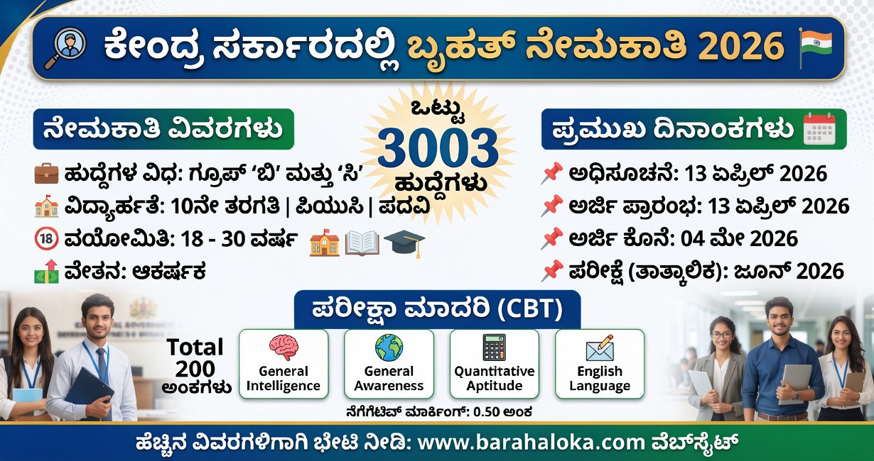 ಕೇಂದ್ರ ಸರ್ಕಾರಿ ಉದ್ಯೋಗದ ಸುವರ್ಣ ಅವಕಾಶ: 3003 ಹುದ್ದೆಗಳ ಬೃಹತ್ ನೇಮಕಾತಿ 2026 – ಸಂಪೂರ್ಣ ಮಾಹಿತಿ