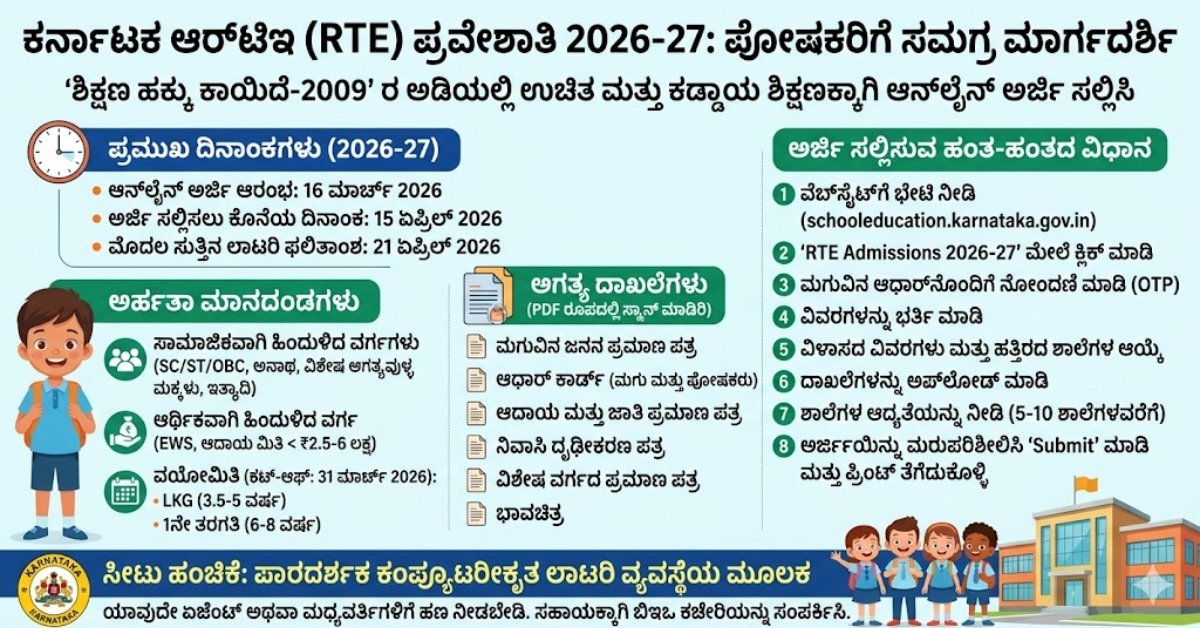 ಭಾರತೀಯ ಸಂವಿಧಾನದ 21-ಎ ವಿಧಿಯ ಅಡಿಯಲ್ಲಿ ಜಾರಿಗೆ ಬಂದ ‘ಶಿಕ್ಷಣ ಹಕ್ಕು ಕಾಯಿದೆ-2009’ (Right to Education – RTE), ಆರ್ಥಿಕವಾಗಿ ಹಿಂದುಳಿದ ಮತ್ತು ಸಾಮಾಜಿಕವಾಗಿ ವಂಚಿತ ವರ್ಗಗಳ ಮಕ್ಕಳಿಗೆ ಗುಣಮಟ್ಟದ ಶಿಕ್ಷಣವನ್ನು ಖಚಿತಪಡಿಸುವ ಮಹತ್ತರ ಗುರಿಯನ್ನು ಹೊಂದಿದೆ. ಕರ್ನಾಟಕ ಸರ್ಕಾರವು 2026-27ನೇ ಶೈಕ್ಷಣಿಕ ಸಾಲಿಗಾಗಿ ಆರ್‌ಟಿಇ ಪ್ರವೇಶ ಪ್ರಕ್ರಿಯೆಯನ್ನು ಅಧಿಕೃತವಾಗಿ ಆರಂಭಿಸಿದ್ದು, ಅರ್ಜಿ ಸಲ್ಲಿಸಲು ಮಾರ್ಚ್ 16 ರಿಂದ ಏಪ್ರಿಲ್ 15, 2026 ರವರೆಗೆ ಕಾಲಾವಕಾಶ ನೀಡಲಾಗಿದೆ.