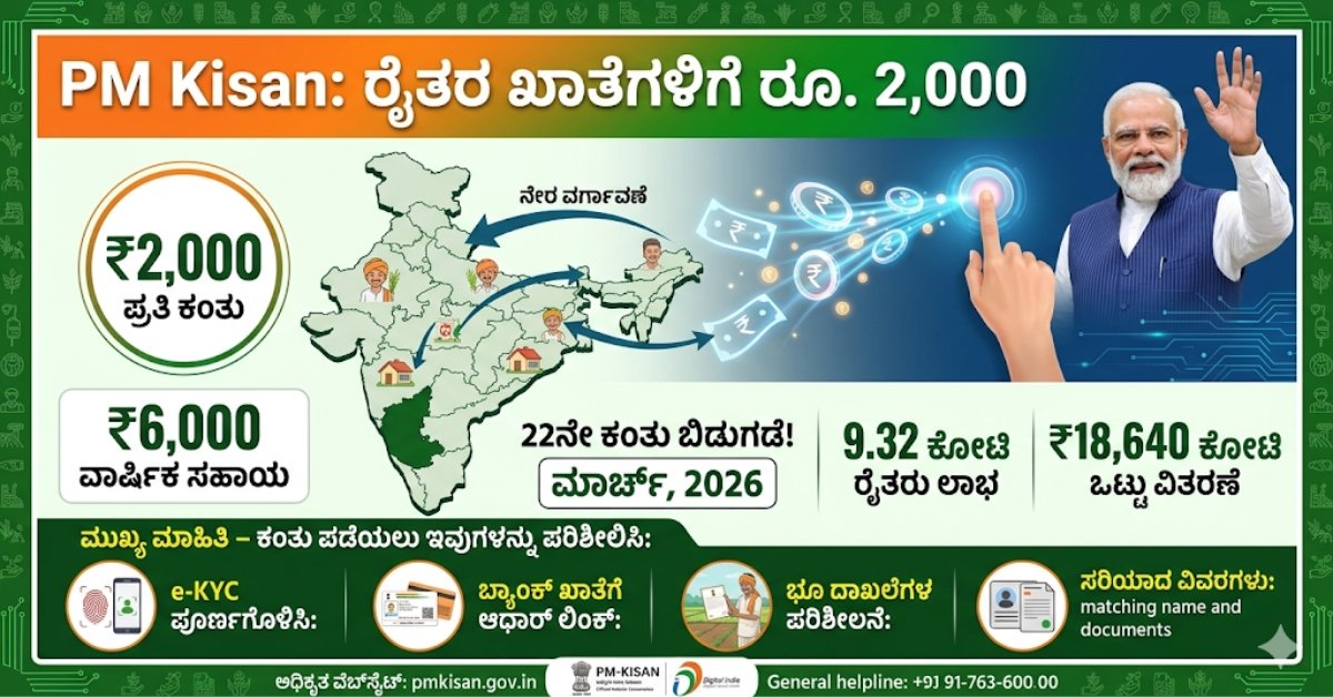 PM Kisan ಯೋಜನೆ ಭಾರತದಲ್ಲಿನ ರೈತರಿಗೆ ಅತ್ಯಂತ ಉಪಯುಕ್ತ ಯೋಜನೆಯಾಗಿದೆ. ವರ್ಷಕ್ಕೆ ₹6,000 ಹಣ ಸಣ್ಣ ರೈತರಿಗೆ ಕೃಷಿ ಕಾರ್ಯಗಳಲ್ಲಿ ಮಹತ್ವದ ನೆರವಾಗುತ್ತಿದೆ. 2026ರ ಮಾರ್ಚ್ನಲ್ಲಿ ಬಿಡುಗಡೆಯಾಗುವ 22ನೇ ಕಂತು ಕೂಡ ರೈತರಿಗೆ ಆರ್ಥಿಕವಾಗಿ ಸಹಾಯ ಮಾಡಲಿದೆ.