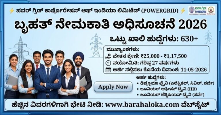 ಪವರ್ ಗ್ರಿಡ್ ಕಾರ್ಪೊರೇಷನ್ ಆಫ್ ಇಂಡಿಯಾ ಲಿಮಿಟೆಡ್ (POWERGRID) ನೇಮಕಾತಿ 2026: 630+ ಹುದ್ದೆಗಳಿಗೆ ಬೃಹತ್ ಅಧಿಸೂಚನೆ ಪ್ರಕಟ! POWERGRID Recruitment 2026 ಭಾರತೀಯ ಇಂಧನ ಕ್ಷೇತ್ರದಲ್ಲಿ …