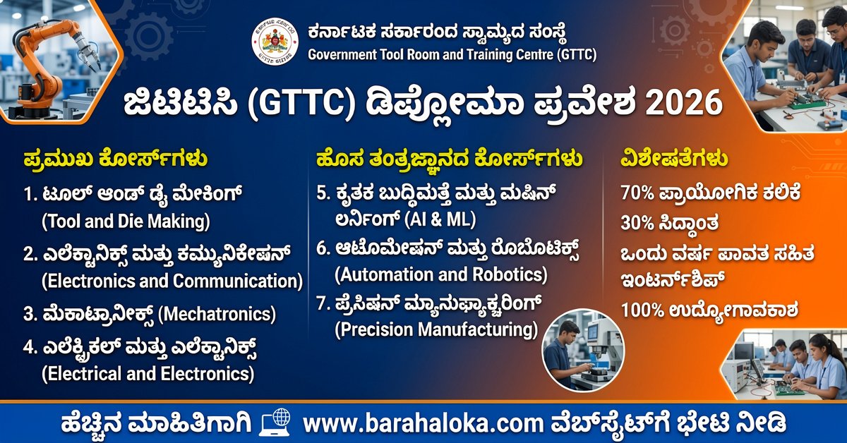 GTTC ಪ್ರವೇಶ 2026: ಎಸ್ಎಸ್ಎಲ್ಸಿ ಮತ್ತು ಪಿಯುಸಿ ನಂತರ ಉದ್ಯೋಗಾಧಾರಿತ ಡಿಪ್ಲೋಮಾ ಕೋರ್ಸ್ಗಳ ಸಂಪೂರ್ಣ ಮಾಹಿತಿ