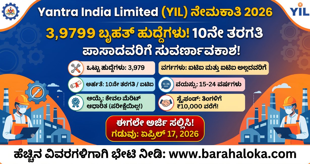 YIL Recruitment 2026: ಯಂತ್ರ ಇಂಡಿಯಾ ಲಿಮಿಟೆಡ್ನಲ್ಲಿ 3,979 ಬೃಹತ್ ಹುದ್ದೆಗಳ ನೇಮಕಾತಿ – 10ನೇ ತರಗತಿ ಪಾಸಾದವರಿಗೆ ಸುವರ್ಣಾವಕಾಶ!